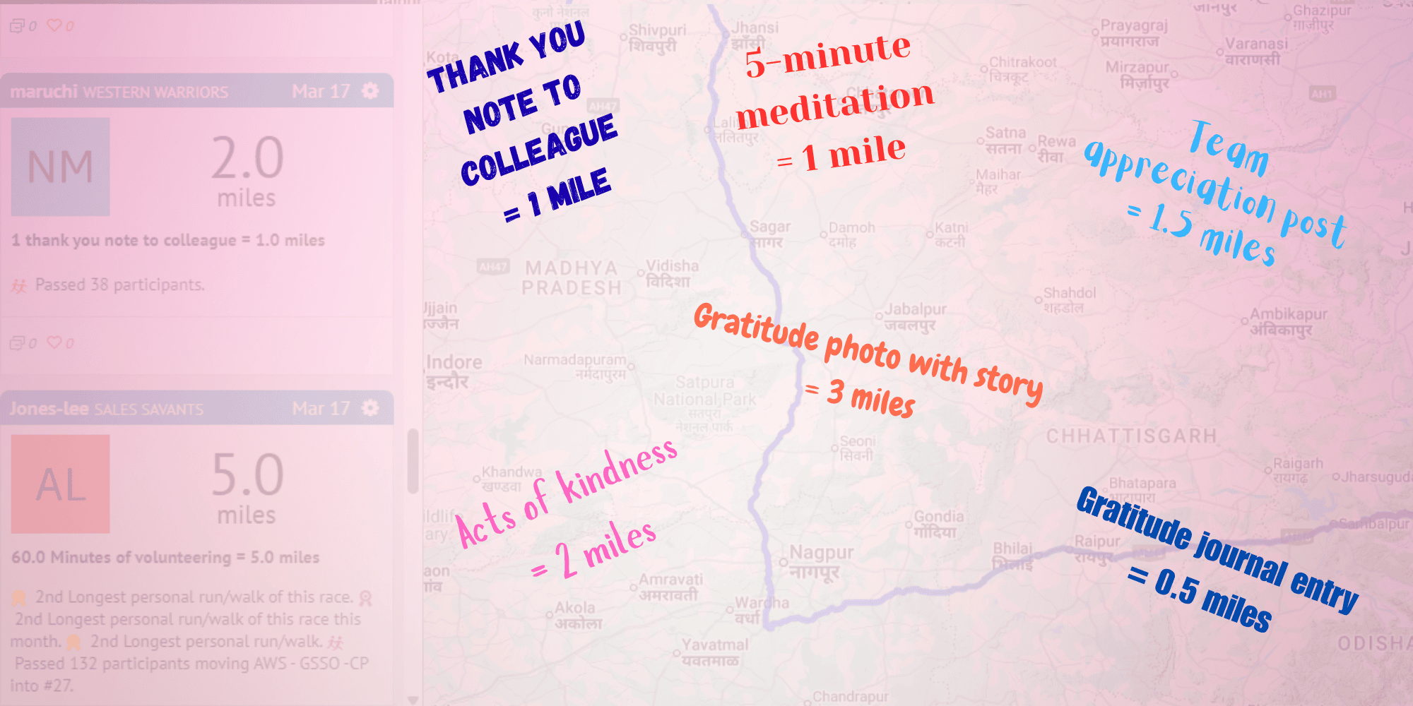 gratitude activities convert to map miles (gratitude lists, appreciation notes, mindful moments)
